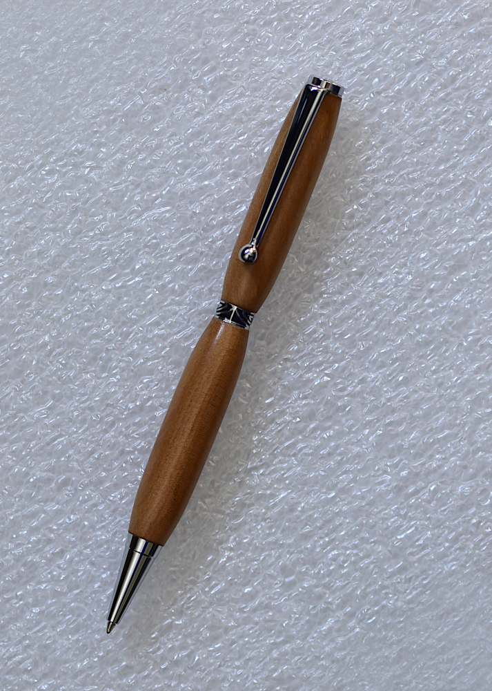 Stylo bille créé en cerisier et agrémenté d’une parure noire et chrome lui donne une belle élégance!