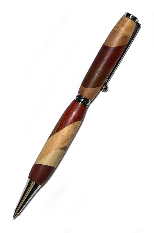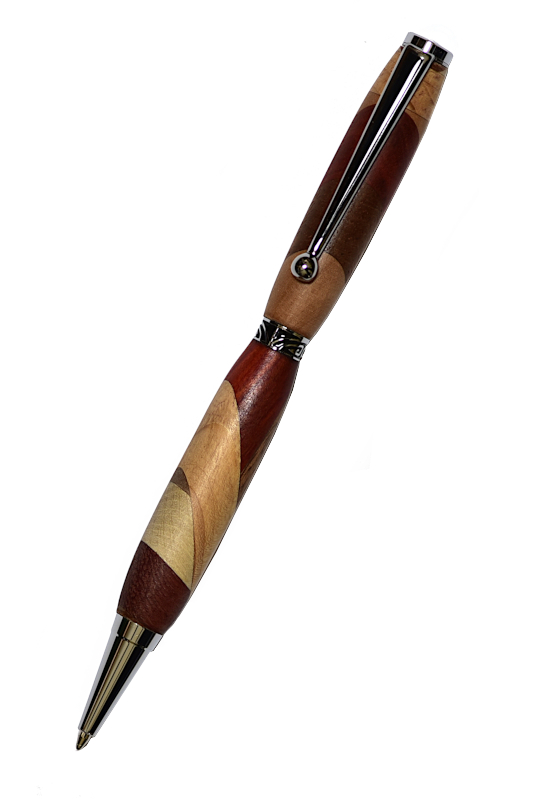 Voici un stylo bille original composé de plusieurs d’essences de bois : acacia, cerisier, limba, red heart, poirier, merisier, ipé, aulne, niangon, cèdre du Liban.